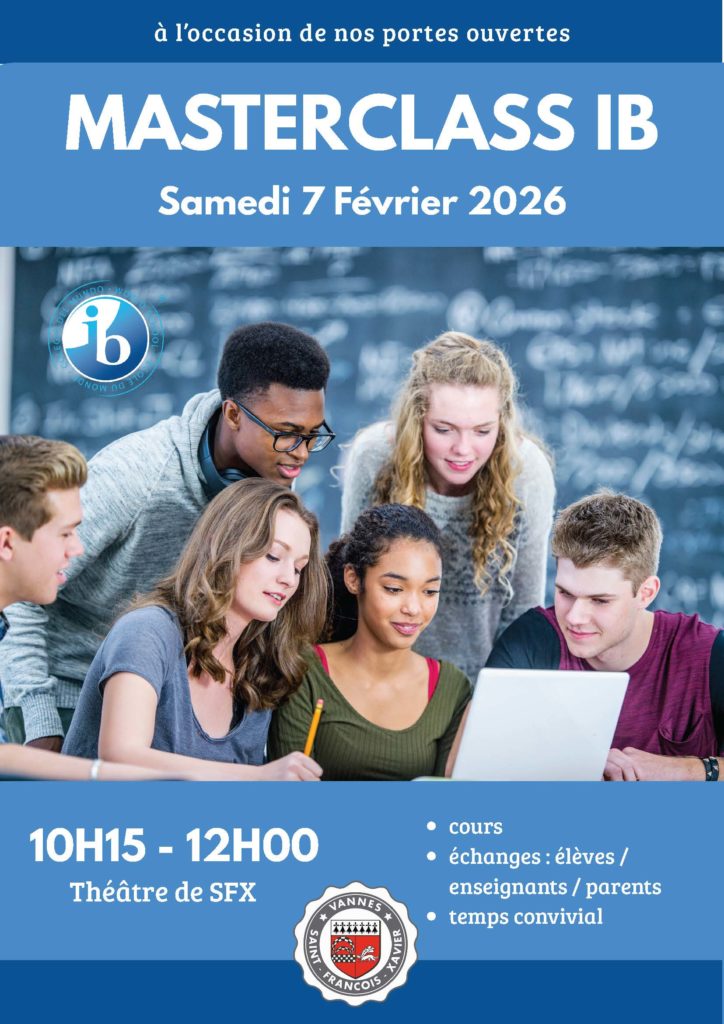 Dans le cadre de la journée porte ouverte du collège lycée Saint-François-Xavier à Vannes, il est possible d’assister à une Masterclass permettant ainsi l’immersion dans un cours du baccalauréat international IB. Samedi 7 février de 10 h à 15 h, lycée Saint François-Xavier